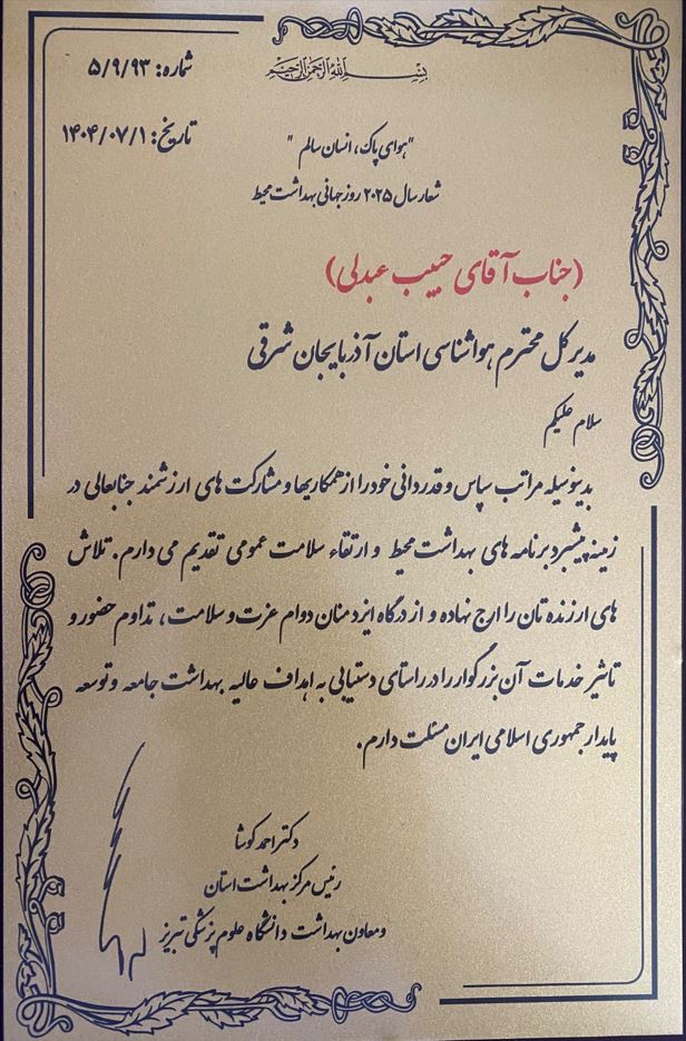 به گزارش روابط عمومی هواشناسی استان آذربایجان شرقی در تقدیرنامه که توسط دکتر احمد کوشا، رئیس مرکز بهداشت استان و معاون بهداشت دانشگاه علوم پزشکی تبریز صادر شده، مراتب سپاس و قدردانی از زحمات و مشارکتهای ارزشمند مدیر کل هواشناسی استان در برنامههای بهداشت محیط و ارتقاء سلامت عمومی ابراز گردیده است